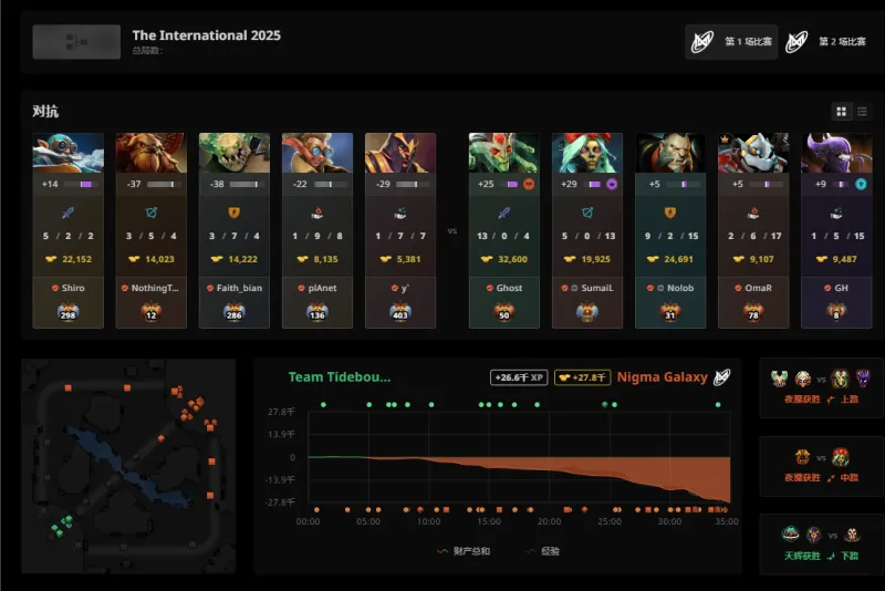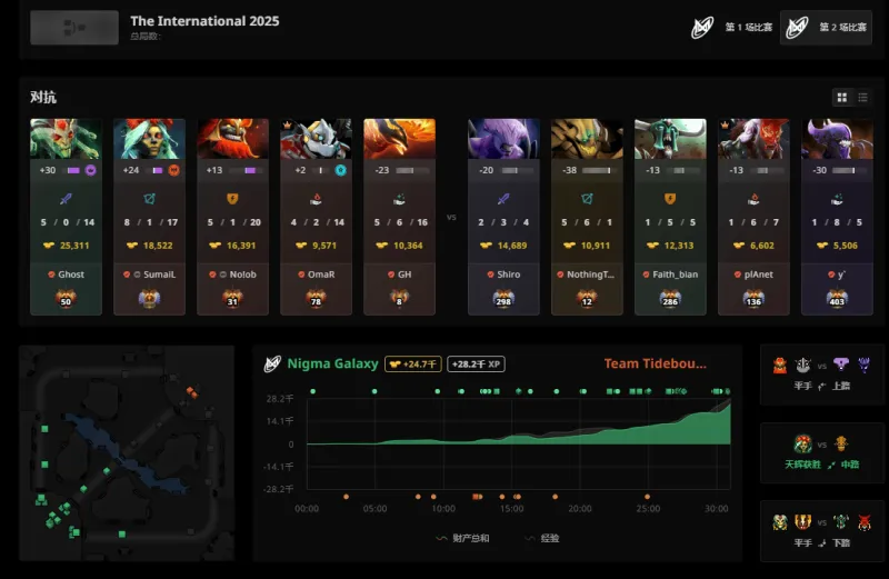 虎扑09月12日讯 在刚刚结束的2025DOTA2国际邀请赛(TI14)败者组首轮比赛中,CN赛区战队Tidebound被Nigma Galaxy以2-0横扫,最终止步本次赛事八强未能进入前六。而本次赛事剩下的CN赛区战队也仅有XG一支。XG将在随后的胜者组半决赛对阵PVISION